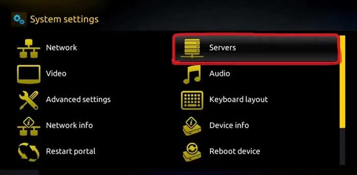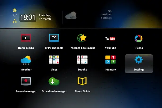 When the box is being loaded the main portal screen appears. After that click on “settings”, press remote button “SETUP/SET”